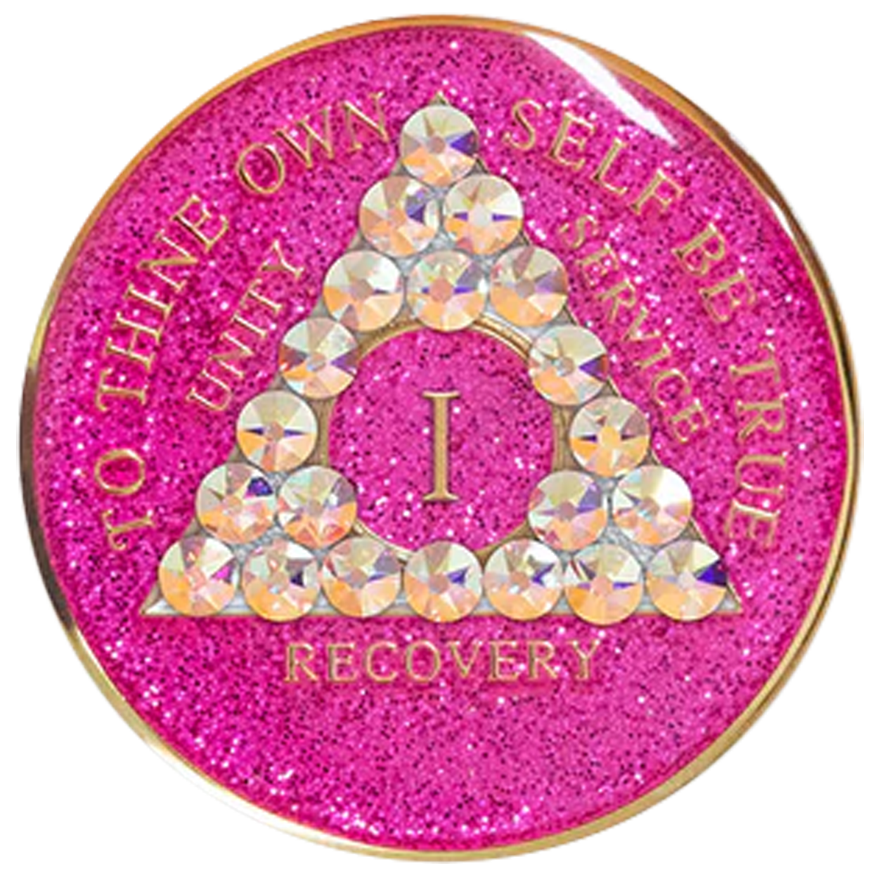 This recovery coin features a stunning multi-colored enamel design, engraved with 24Kt gold plating. On the front, the timeless 12-step program phrase "To Thine Own Self Be True" is engraved, along with the anniversary year in Roman numerals and the words "Unity, Service, Recovery." On the back, the Serenity Prayer is engraved.