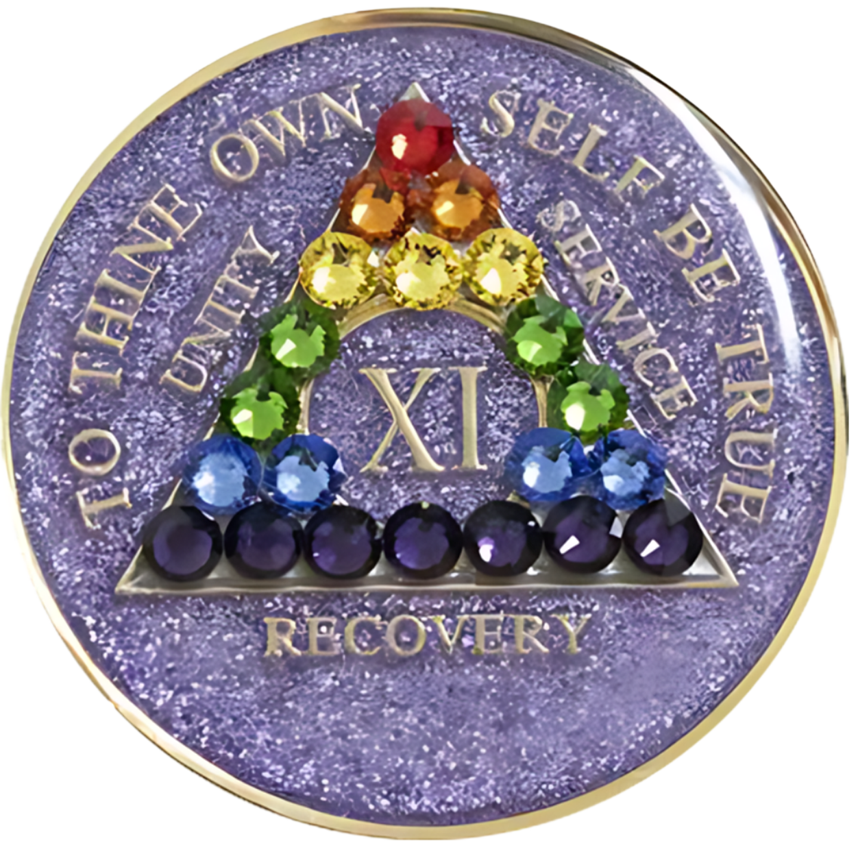This recovery coin features a stunning multi-colored enamel design, engraved with 24Kt gold plating. On the front, the timeless 12-step program phrase "To Thine Own Self Be True" is engraved, along with the anniversary year in Roman numerals and the words "Unity, Service, Recovery." On the back, the Serenity Prayer is engraved.