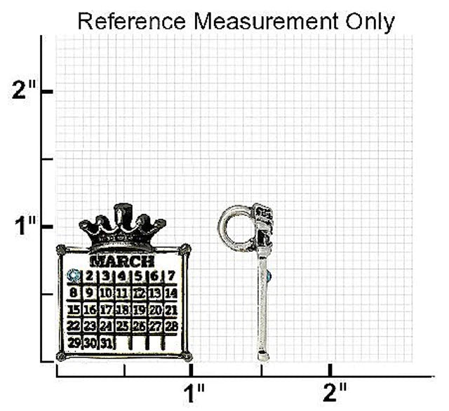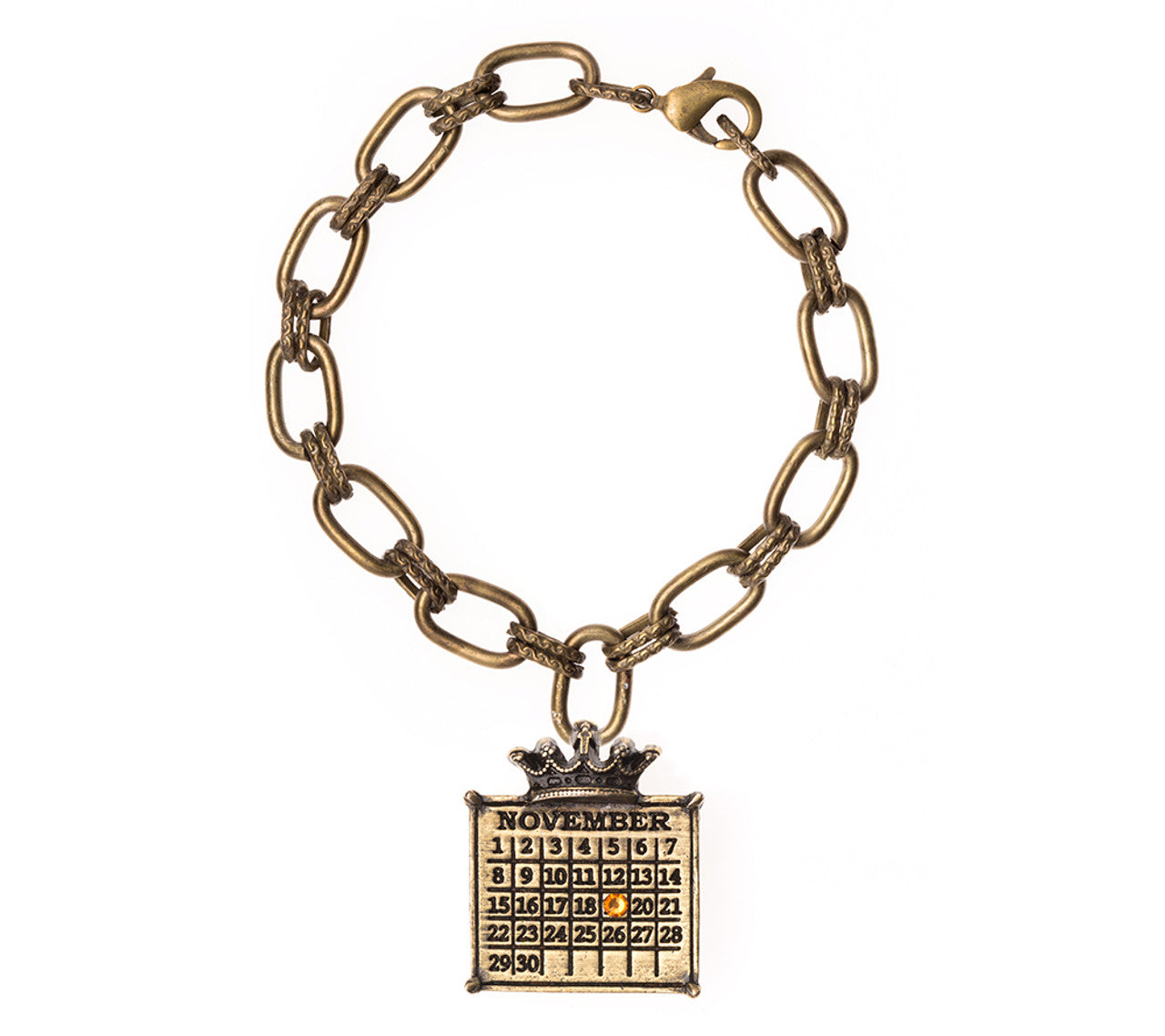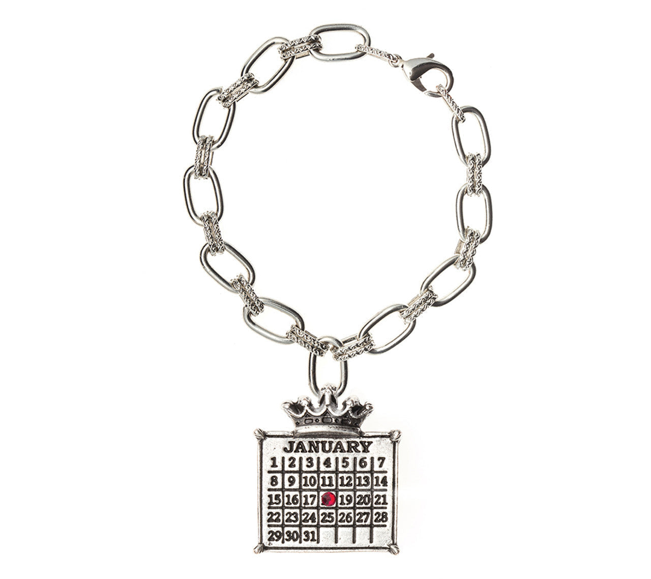 The Not Just Any Old Day...It's Your Special Day® Calendar Crown Charm Bracelet features the month of your choice with a crystal that marks your special day. Our Calendar Bracelet incorporates our popular signature calendar "Datesake™" charm into a hip, stylish accessory that is not only beautiful but is a lovely, sentimental addition to your bracelet collection. Choose between Antique Silver or Antique Brass. Our plated pewter charm measuring 3/4" x 1" has a hand antiqued finish. Presented in a satin bag.