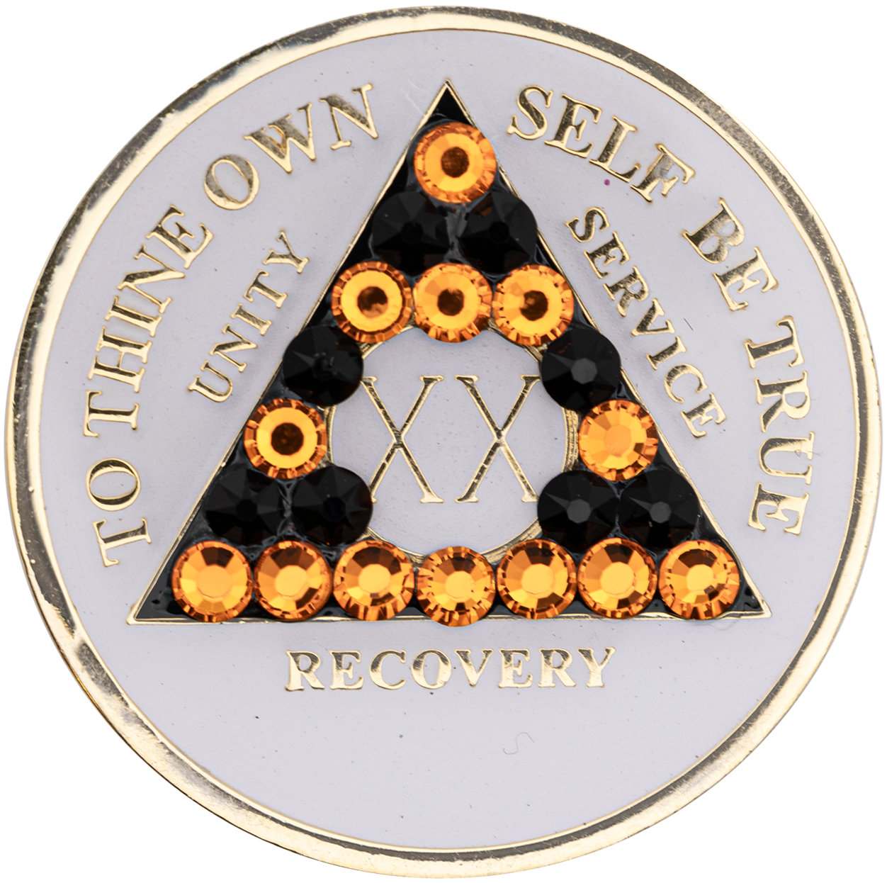 This recovery coin features a stunning multi-colored enamel design, engraved with 24Kt gold plating. On the front, the timeless 12-step program phrase "To Thine Own Self Be True" is engraved, along with the anniversary year in Roman numerals and the words "Unity, Service, Recovery." On the back, the Serenity Prayer is engraved.