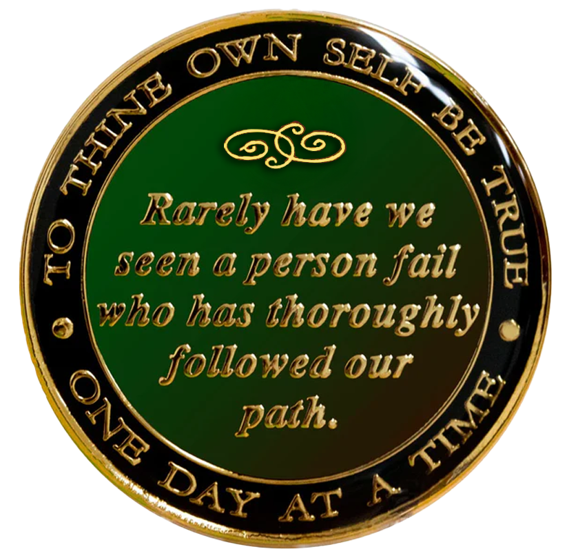 This recovery coin showcases a beautiful multi-colored enamel design, engraved with 24kt gold plating. On the front, the founding members of AA, Bill Wilson and Dr. Bob Smith, along with the anniversary year in Roman numerals, and "Unity, Service, Recovery" around the edge. On the back of the coin is the famous AA quote, "Rarely have we seen a person fail who has thoruoughly followed our path."