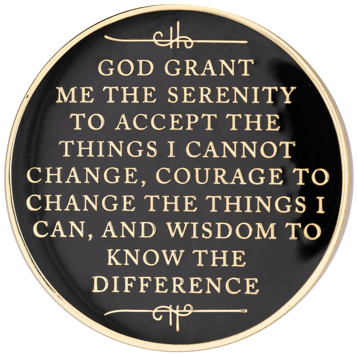 This recovery coin features a stunning multi-colored enamel design, engraved with 24Kt gold plating. On the front, the timeless 12-step program phrase "To Thine Own Self Be True" is engraved, along with the anniversary year in Roman numerals and the words "Unity, Service, Recovery." On the back, the Serenity Prayer is engraved.