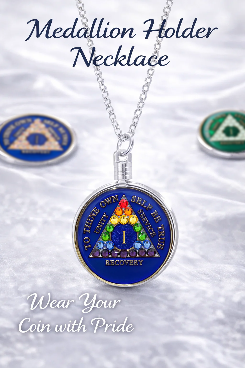 Silver plated medallion holder on a gorgeous 24 inch "flat curb" silver chain, pictured separately. Holds all kinds of medallions that we sell in our store and online. You can change your coin anytime, the screw top assembly is easy to change coins regularly.