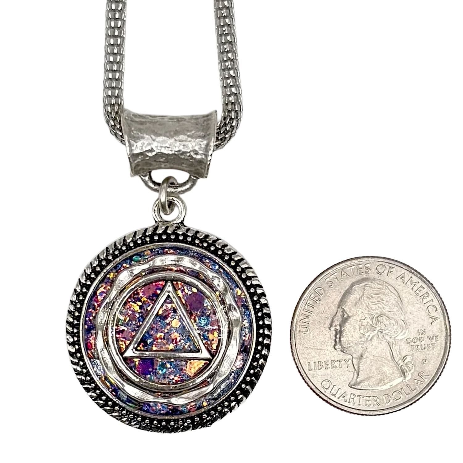 Adjustable 18-22’’ silver plated chain.