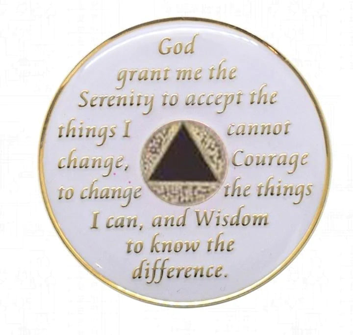 This recovery coin features a stunning multi-colored enamel design, engraved with 24Kt gold plating. On the front, the timeless 12-step program phrase "To Thine Own Self Be True" is engraved, along with the anniversary year in Roman numerals and the words "Unity, Service, Recovery." On the back, the Serenity Prayer is engraved.