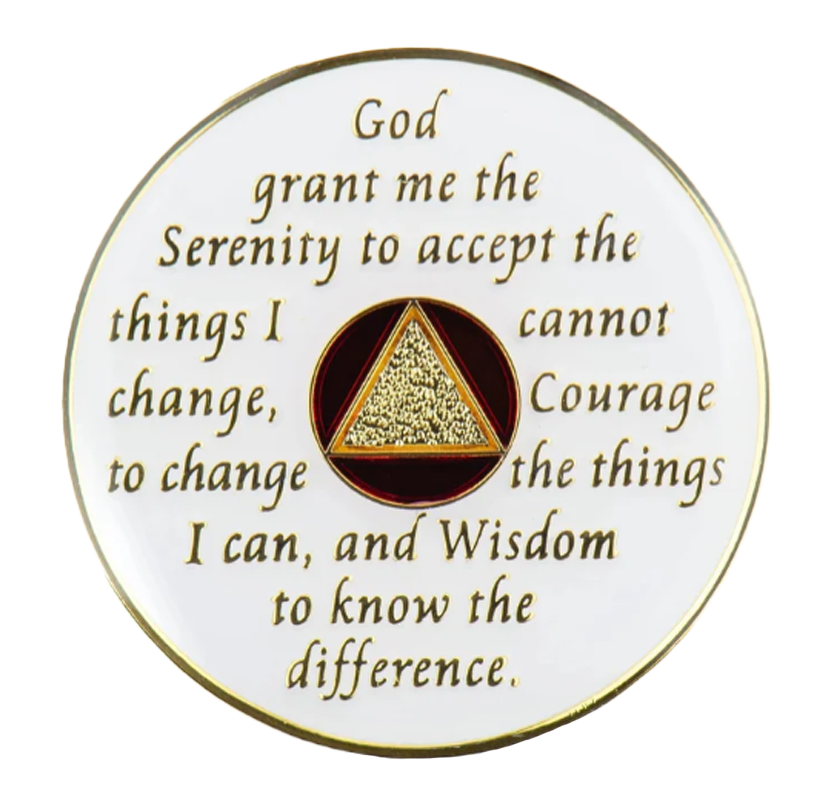 This recovery coin features a stunning multi-colored enamel design, engraved with 24Kt gold plating. On the front, the timeless 12-step program phrase "To Thine Own Self Be True" is engraved, along with the anniversary year in Roman numerals and the words "Unity, Service, Recovery." On the back, the Serenity Prayer is engraved.