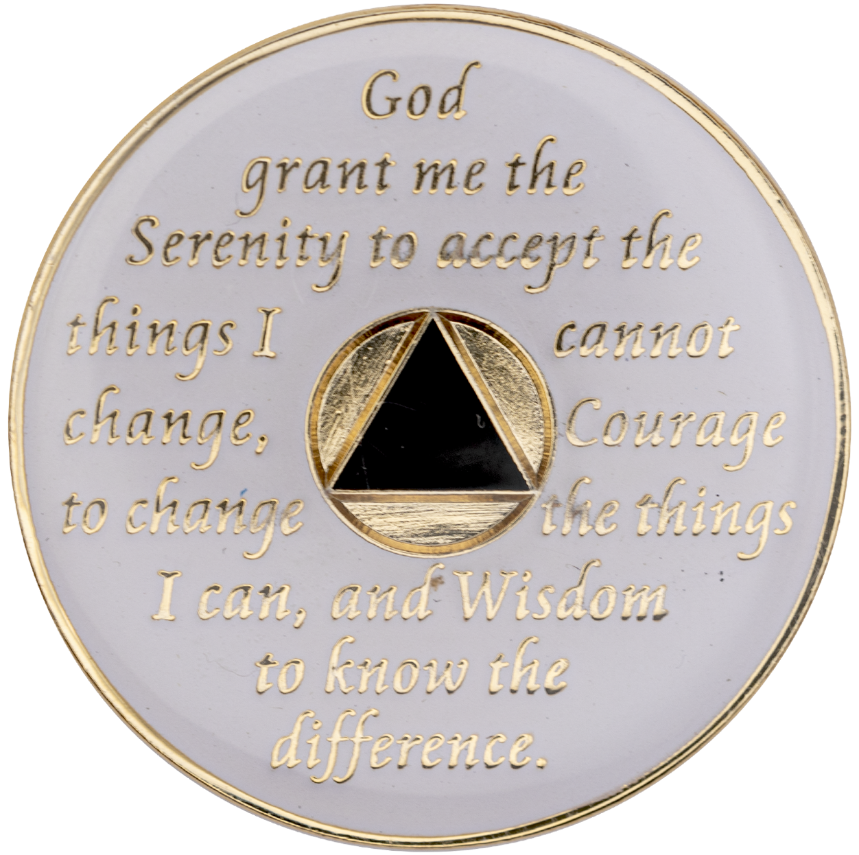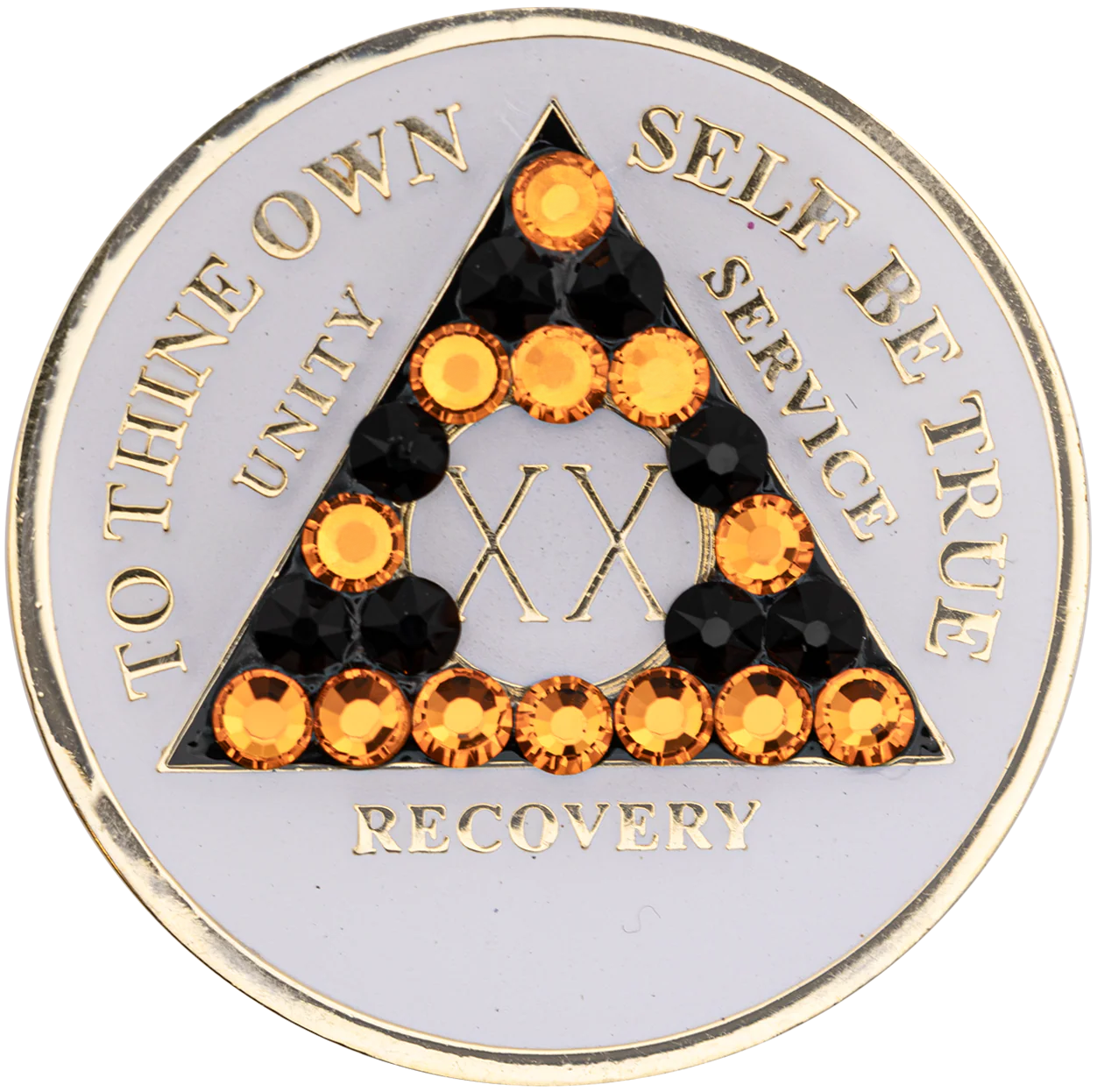 This recovery coin features a stunning multi-colored enamel design, engraved with 24Kt gold plating. On the front, the timeless 12-step program phrase "To Thine Own Self Be True" is engraved, along with the anniversary year in Roman numerals and the words "Unity, Service, Recovery." On the back, the Serenity Prayer is engraved.
