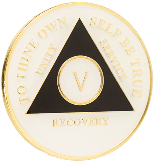 This recovery coin features a stunning multi-colored enamel design, engraved with 24Kt gold plating. On the front, the timeless 12-step program phrase "To Thine Own Self Be True" is engraved, along with the anniversary year in Roman numerals and the words "Unity, Service, Recovery." On the back, the Serenity Prayer is engraved.
