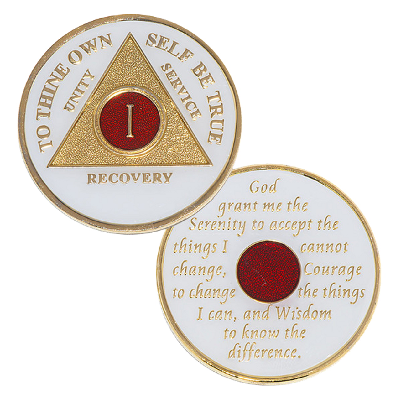 This recovery coin features a stunning multi-colored enamel design, engraved with 24Kt gold plating. On the front, the timeless 12-step program phrase "To Thine Own Self Be True" is engraved, along with the anniversary year in Roman numerals and the words "Unity, Service, Recovery." On the back, the Serenity Prayer is engraved.