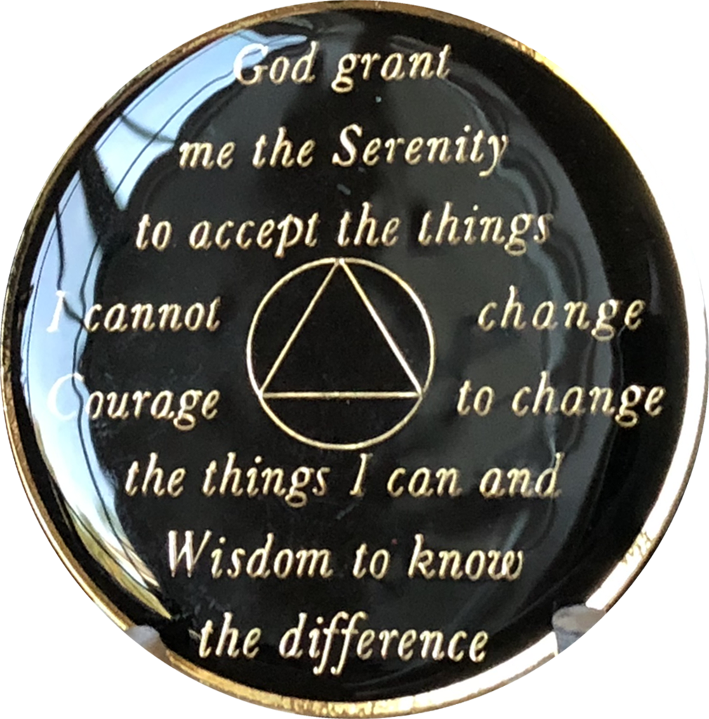This recovery coin features a stunning multi-colored enamel design, engraved with 24Kt gold plating. On the front, the timeless 12-step program phrase "To Thine Own Self Be True" is engraved, along with the anniversary year in Roman numerals and the words "Unity, Service, Recovery." On the back, the Serenity Prayer is engraved.