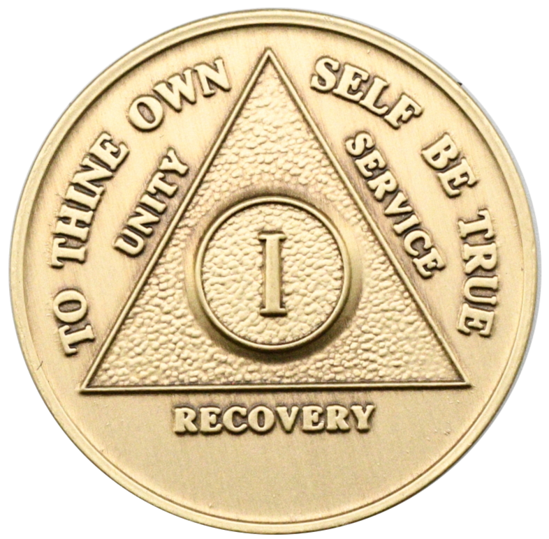 The front of this beautiful coin is engraved with the revered Twelve Step program phrase "To Thine Own Self Be True," alongside the anniversary year in Roman numerals and the words "Unity, Service, Recovery" encircling the Sobriety triangle. Flip it over, and you'll discover the cherished Serenity prayer. This 24kt gold plated, multi-colored enamel coin is a testament to craftsmanship and a perfect symbol of the Twelve Step journey.