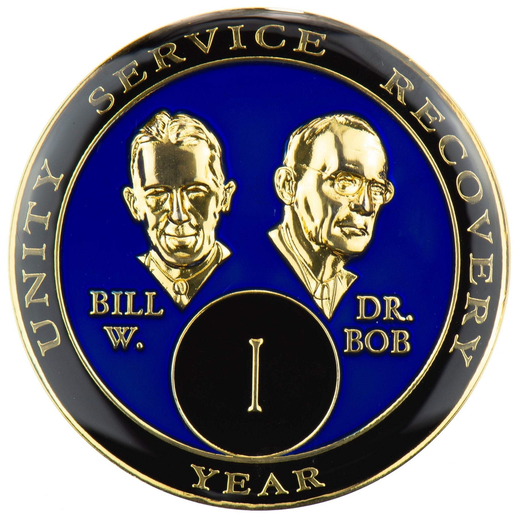 This recovery coin showcases a beautiful multi-colored enamel design, engraved with 24kt gold plating. On the front, the founding members of AA, Bill Wilson and Dr. Bob Smith, along with the anniversary year in Roman numeral, and "Unity, Service, Recovery" around the edge. On the back of the coin is the famous AA quote, "Rarely have we seen a person fail who has followed our path."