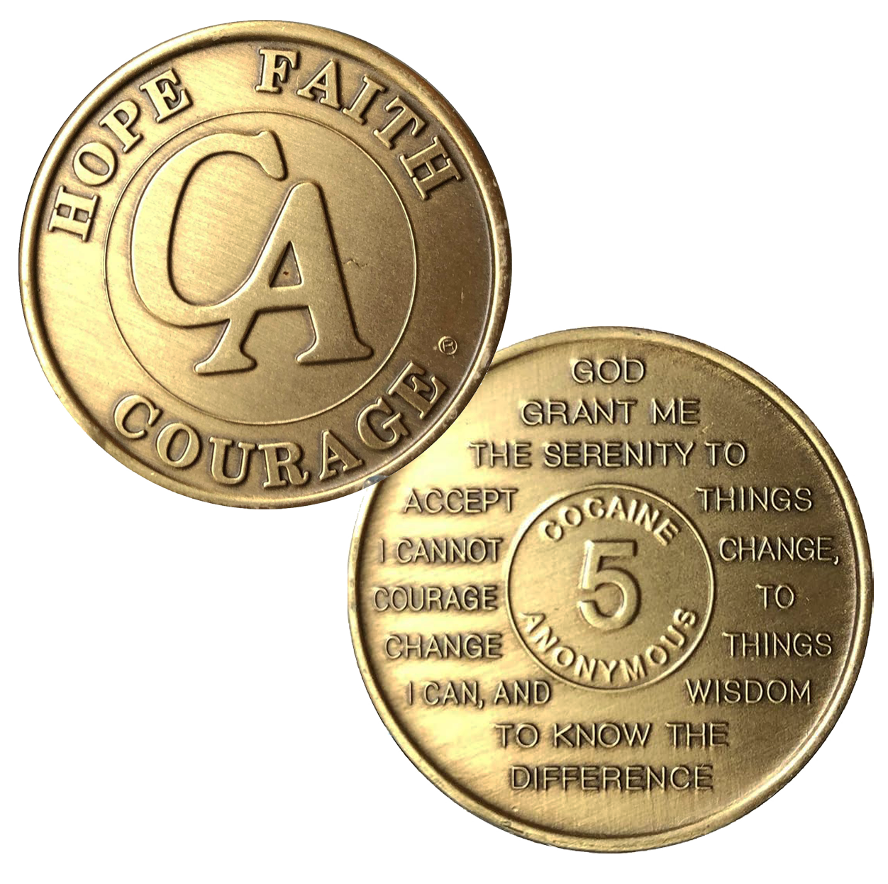 Introducing CHOICES — Cocaine Anonymous Bronze Medallion featuring the inspiring words "Hope, Faith, Courage" on the front, with the "CA" emblem in the center. The reverse side displays the Serenity Prayer, serving as a timeless reminder of strength and perseverance in recovery.