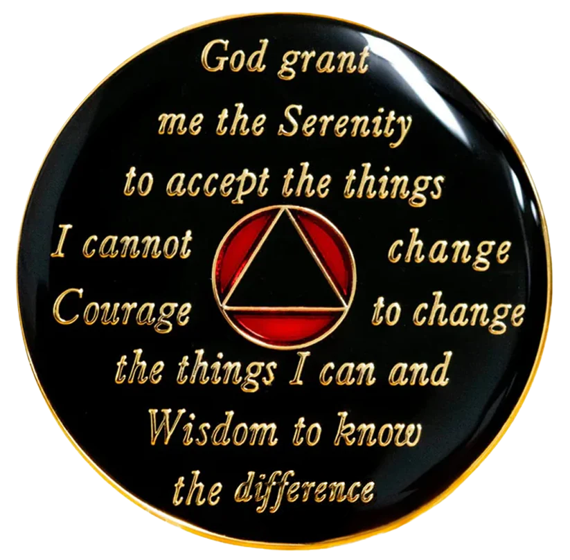 Introducing CHOICES Multi-color best-selling Sobriety Chips, an ideal present for your loved one. This Sobriety recovery medallion showcases a stunning, multi-colored enamel design, engraved with 24kt gold plated engraving with the timeless Twelve Step program phrase "To Thine Own Self Be True" on the front, along with the anniversary year in Roman numeral and the words "Unity, Service, Recovery" encircling the Sobriety triangle. On the reverse side, you'll find the Serenity prayer.
