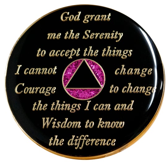 This recovery coin features a stunning multi-colored enamel design, engraved with 24Kt gold plating. On the front, the timeless 12-step program phrase "To Thine Own Self Be True" is engraved, along with the anniversary year in Roman numerals and the words "Unity, Service, Recovery." On the back, the Serenity Prayer is engraved.