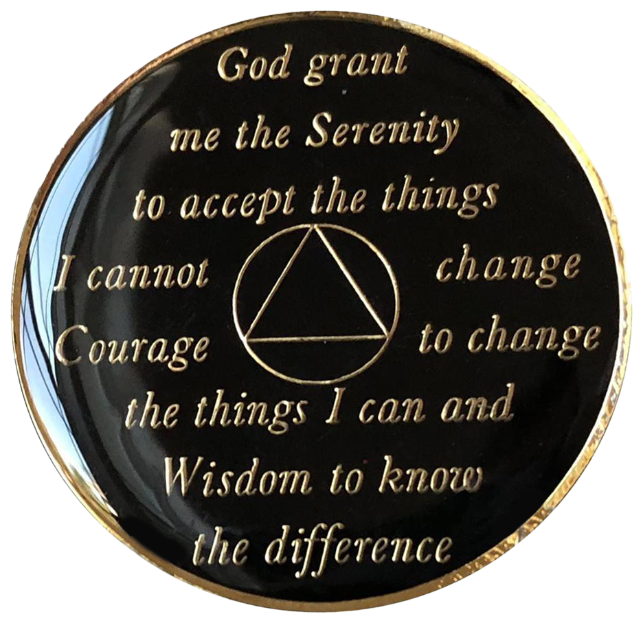 This recovery coin features a stunning multi-colored enamel design, engraved with 24Kt gold plating. On the front, the timeless 12-step program phrase "To Thine Own Self Be True" is engraved, along with the anniversary year in Roman numerals and the words "Unity, Service, Recovery." On the back, the Serenity Prayer is engraved.