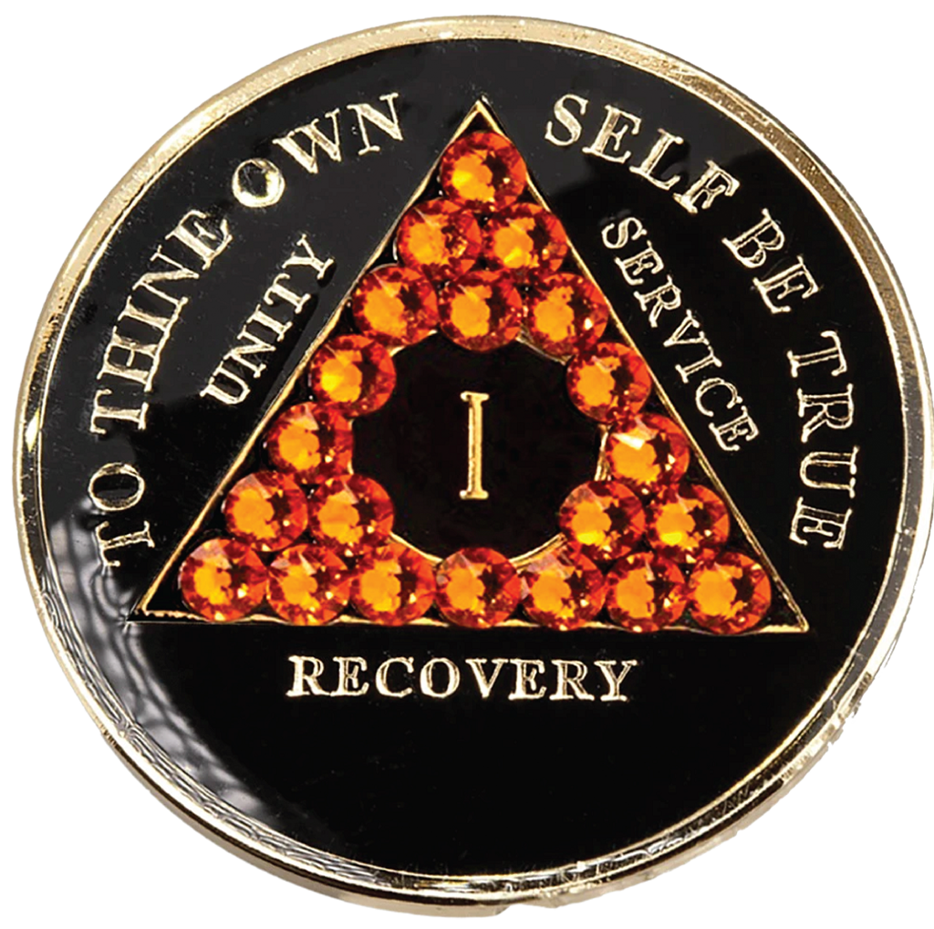 AA Coin, #AA101a. Black AA Medallion w Orange Crystals (Yrs 1-65)