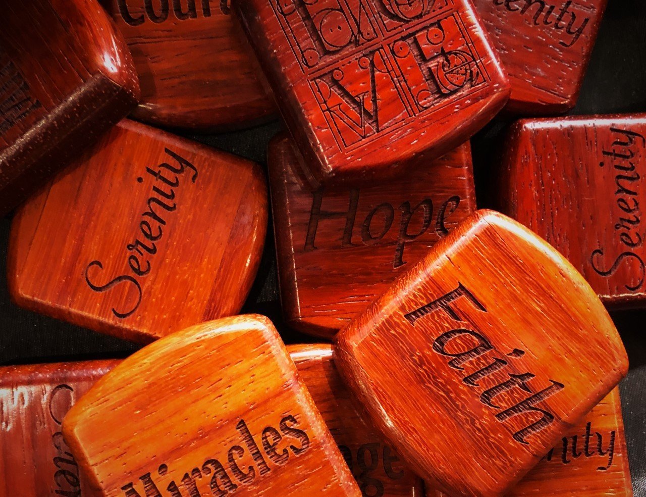 Wooden boxes hold up to 2 coins each and come laser engraved with one of five inspirational words!