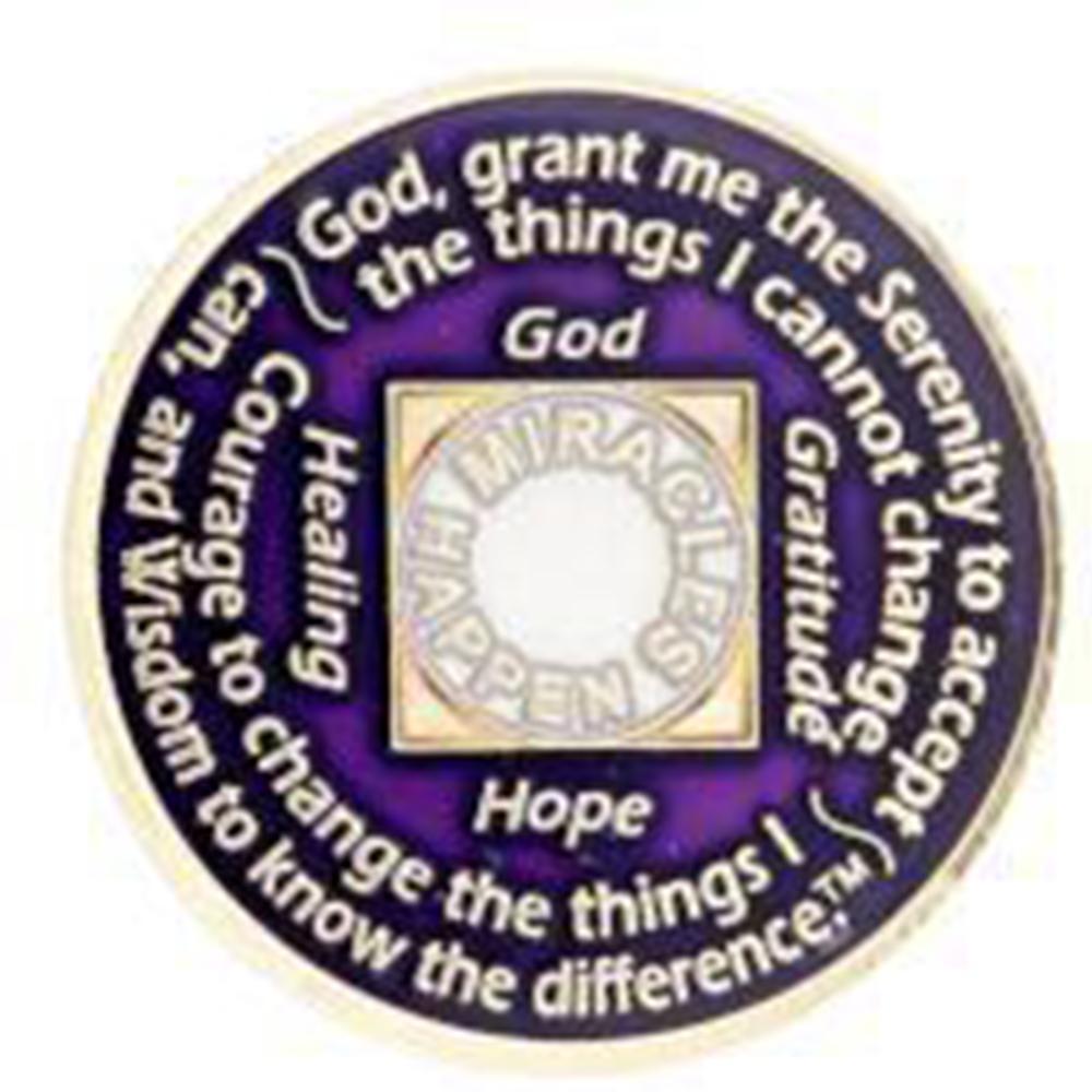 This remarkable medallion displays a stunning multi-colored enamel design, engraved with 24 kt gold-plated lettering and encasement. The front bears the words: “Out of the Ashes of Recovery, Comes Renewal and Growth”, along with the anniversary year in Roman numerals and “Just For Today, Serenity, Peace.” The reverse features the Serenity Prayer alongside “God, Gratitude, Healing, Hope” and “Miracles Happen.”