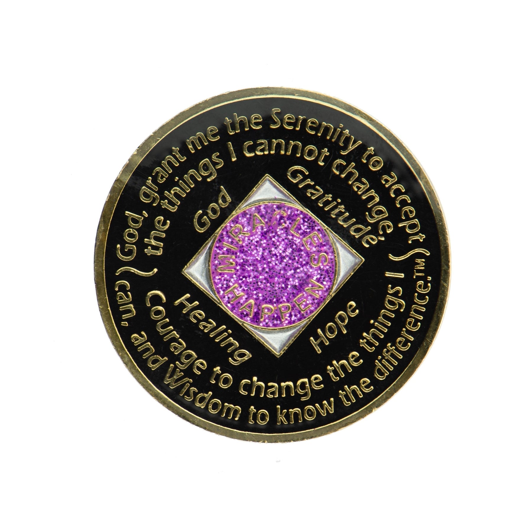 This recovery coin showcases a beautiful multi-colored enamel design, accented with 24 kt gold plating. On the front, it reads: “Out of the Ashes of Recovery, Comes Renewal and Growth” along with the anniversary year in Roman numerals and the words “Just For Today, Serenity, Peace.” On the reverse, you’ll find the Serenity Prayer, “God, Gratitude, Healing, Hope,” and the phrase “Miracles Happen.”