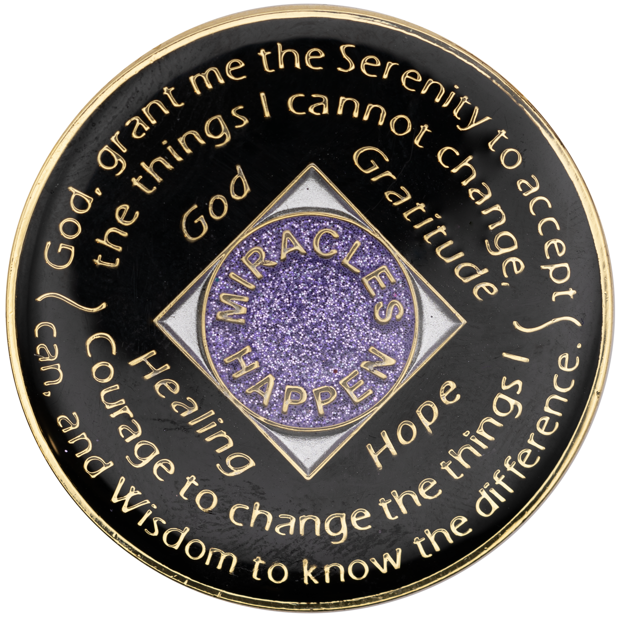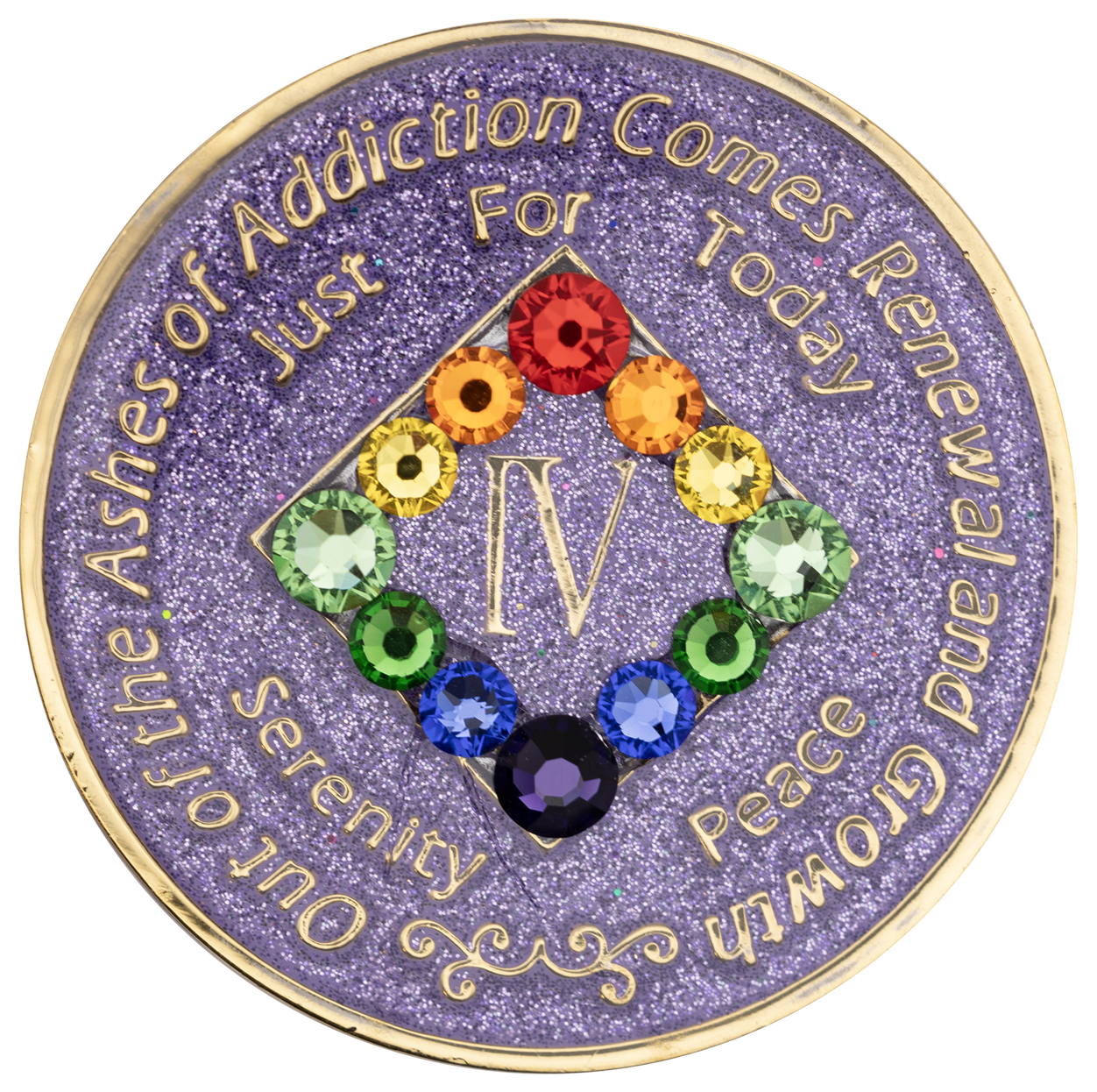 This recovery coin showcases a beautiful multi-colored enamel design, engraved with 24 kt gold plating. On the front, it reads: “Out of the Ashes of Recovery, Comes Renewal and Growth” along with the anniversary year in Roman numerals and the words “Just For Today, Serenity, Peace.” On the reverse is the Serenity Prayer, along with “God, Gratitude, Healing, Hope” and “Miracles Happen.”
