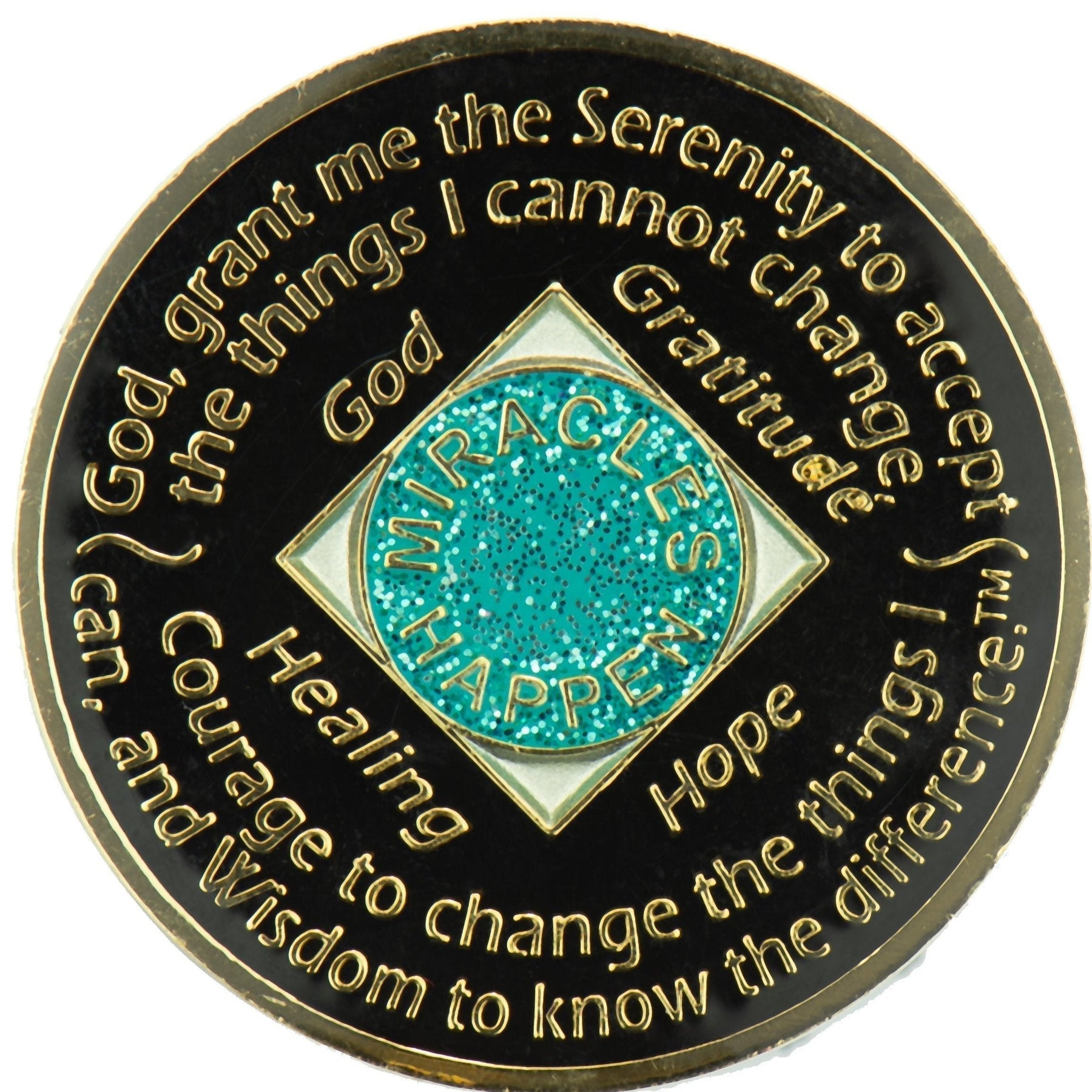 This recovery coin showcases a striking multi-colored enamel design, engraved with 24 kt gold plating. The front reads: “Out of the Ashes of Recovery, Comes Renewal and Growth” alongside the anniversary year in Roman numerals and the words “Just For Today, Serenity, Peace.” On the reverse is the Serenity Prayer with “God, Gratitude, Healing, Hope” and “Miracles Happen.”