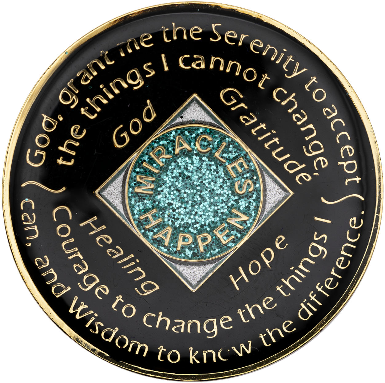 This recovery coin features a beautiful multi-colored enamel design engraved with 24 kt gold plating. On the front, it reads: “Out of the Ashes of Recovery, Comes Renewal and Growth,” along with the anniversary year in Roman numerals and the words “Just For Today, Serenity, Peace.” The reverse side is inscribed with the Serenity Prayer, along with “God, Gratitude, Healing, Hope” and “Miracles Happen.”