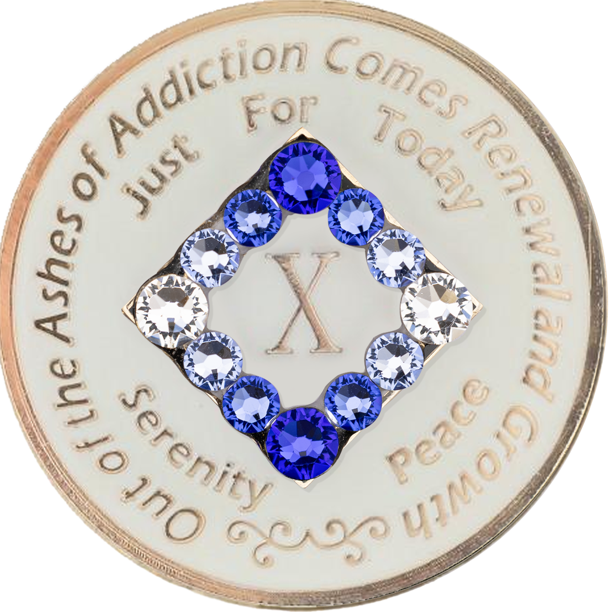 This recovery coin showcases a beautiful multi-colored enamel design, engraved with 24 kt gold plating. On the front is "Out of the Ashes of Recovery, Comes Renewal and Growth," along with the anniversary year in the Roman numeral and the "Just For Today, Serenity, Peace." On the back, the serenity prayer, "God, Gratitude, Healing, Hope," and "Miracles Happen."