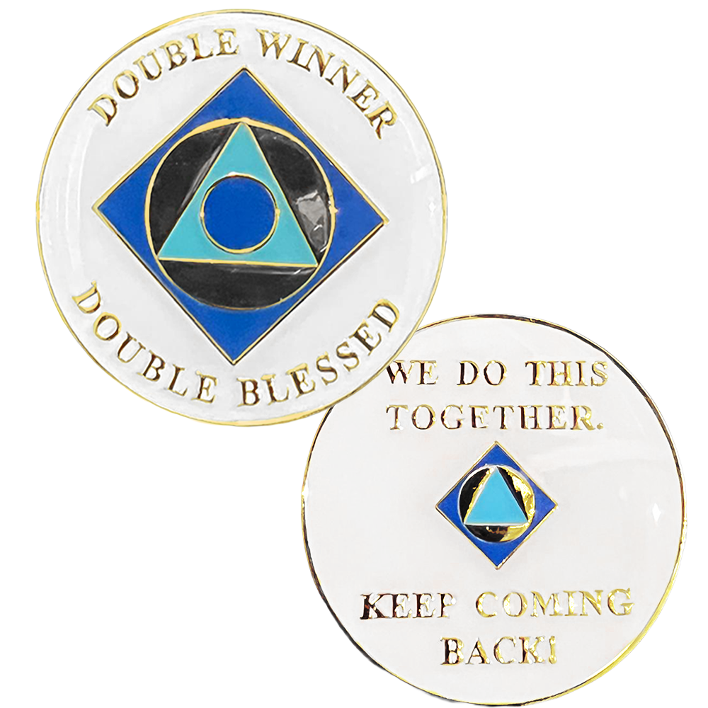 Introducing CHOICES ‚This tri-colored enamel medallion features the time-honored program phrase "Keep Coming Back, It Works" on the front, displayed in a beautiful sky blue, along with Double winner, Double Blessed .