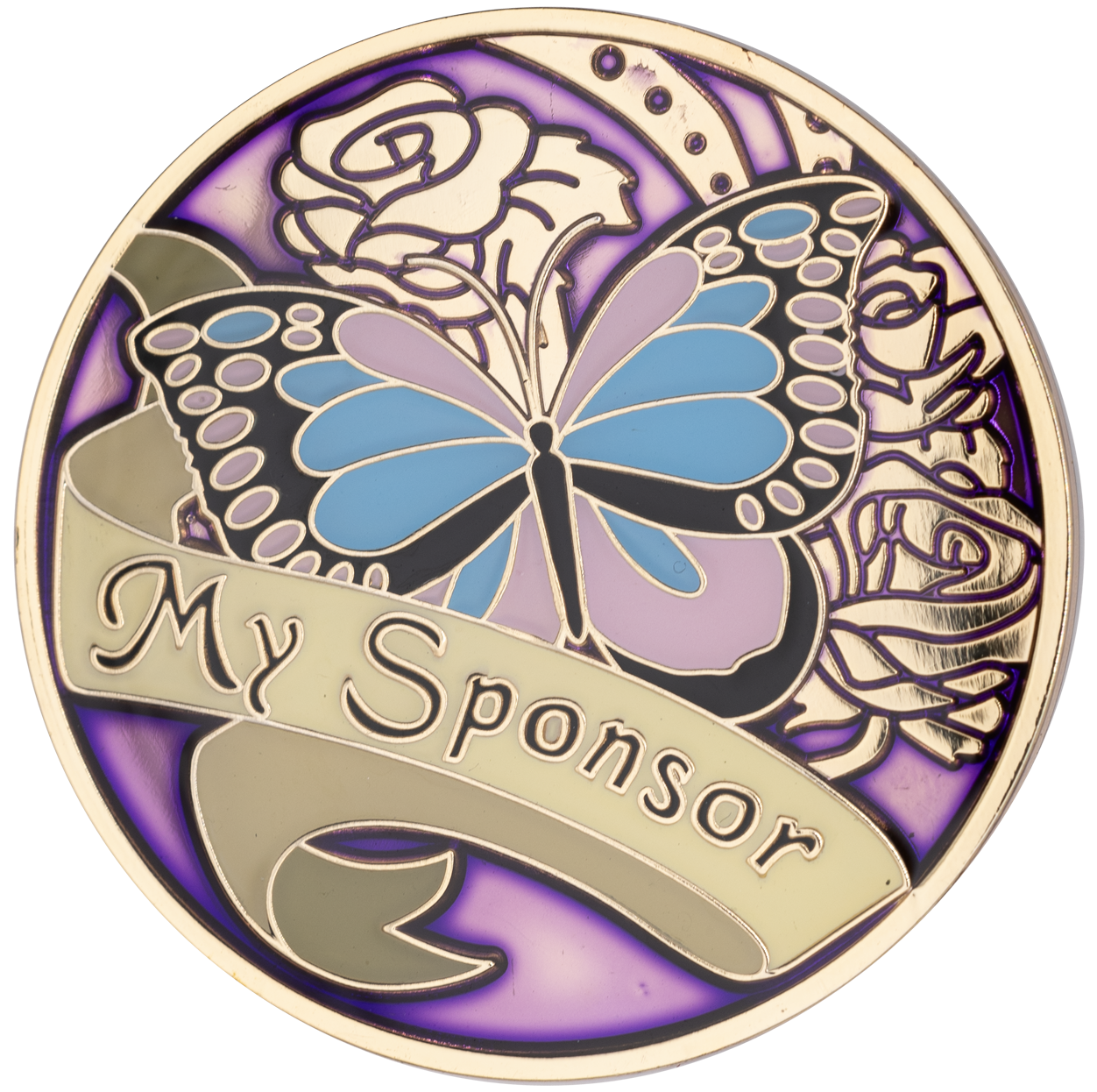 Introducing CHOICES My Sponsor Butterfly and Roses. This lovely gold, purple, blue, pink, and black enamel chip features a pink and blue butterfly, gold roses, & gold banner with the words My Sponsor on the front.