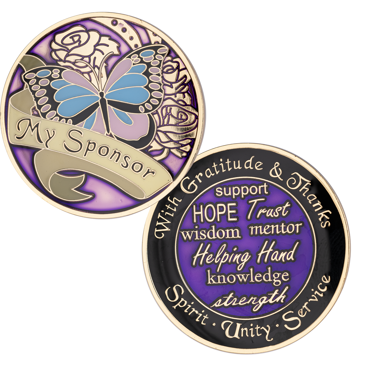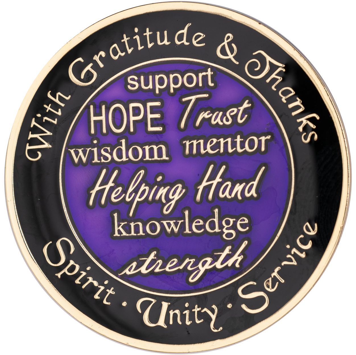 On the back, it reads "With Gratitude & Thanks" and "Spirit Unity Service" along the outside, and in the center lists the words "support, hope, trust, wisdom, mentor, helping hand, knowledge, and strength". Perfect for any program. 38mm round, with 24kt gold plating.
