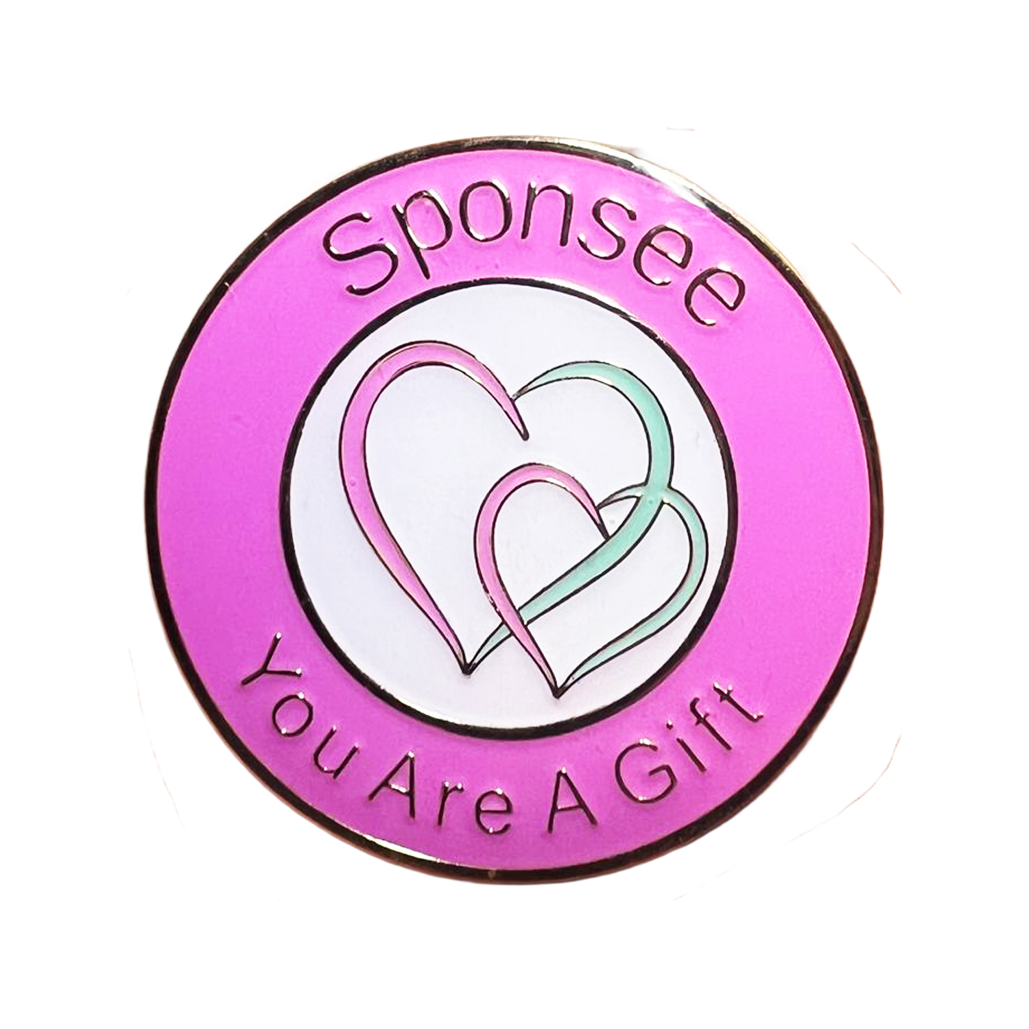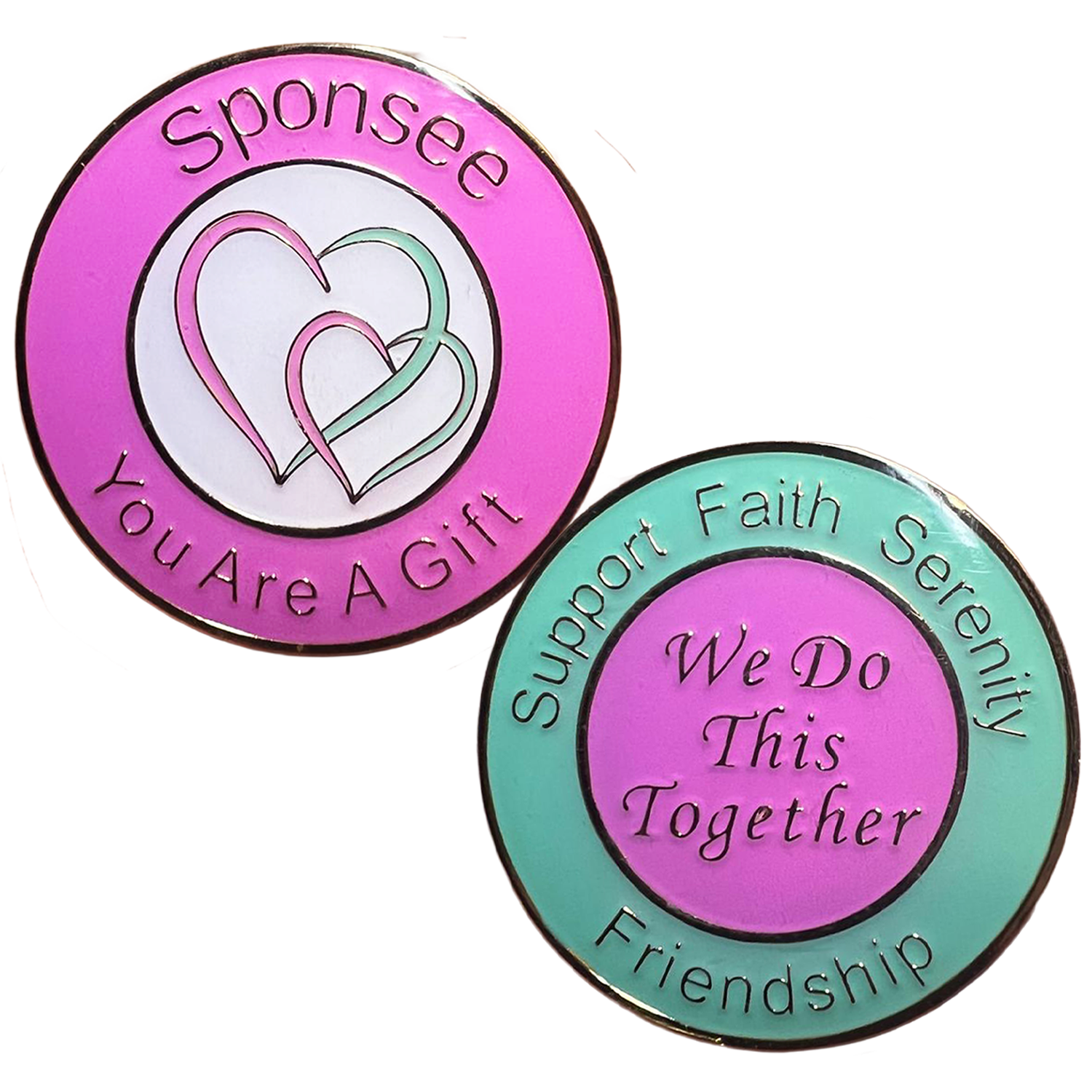 Introducing CHOICES My Sponsee w Double Hearts Coin. This lovely gold, pink and turquoise enamel chip features the words 'Sponsee You are a Gift" on the front.