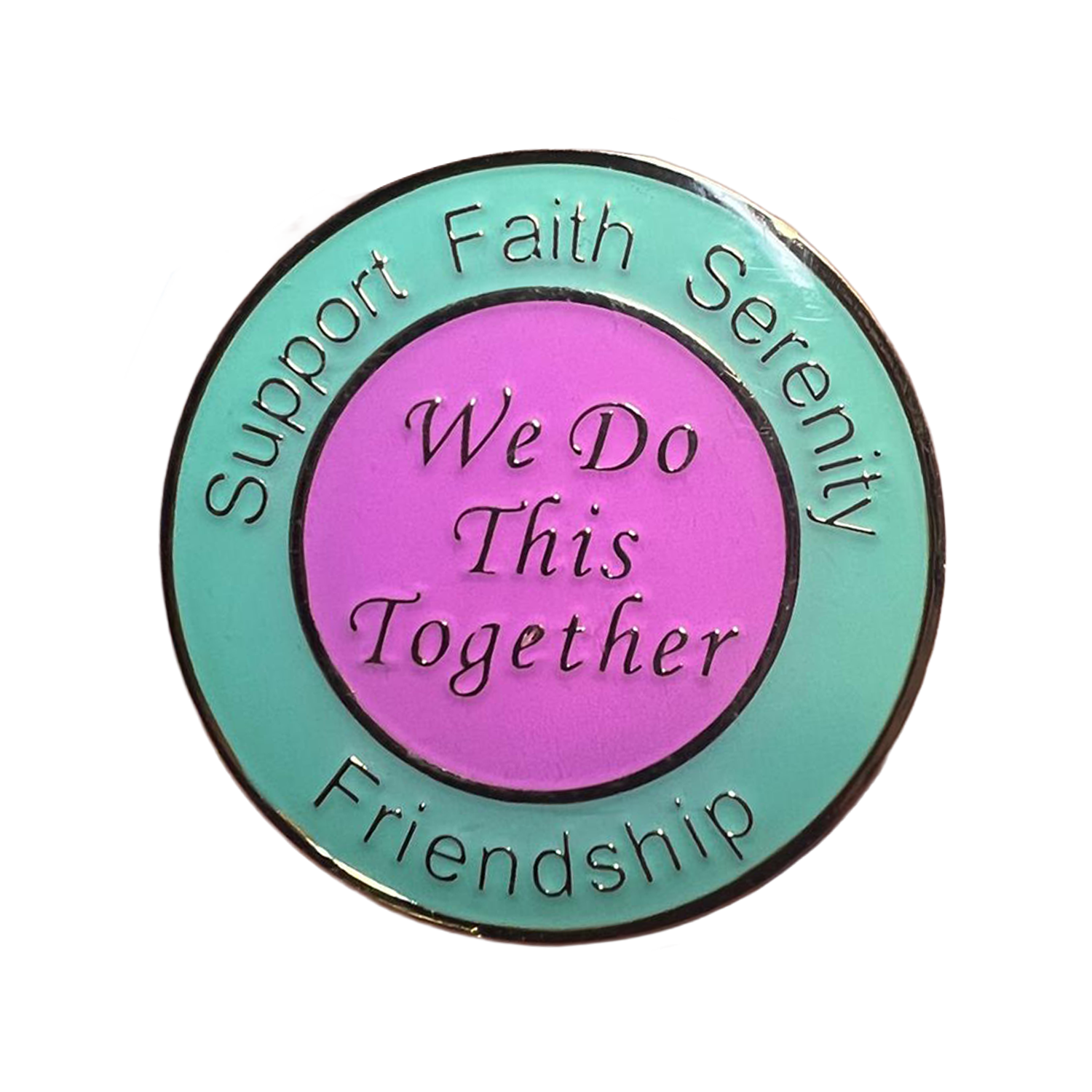 On the back, it reads "Support Faith Serenity Friendship; We do this Together." This coin is perfect for any program. 38mm round, with 24kt gold plating.