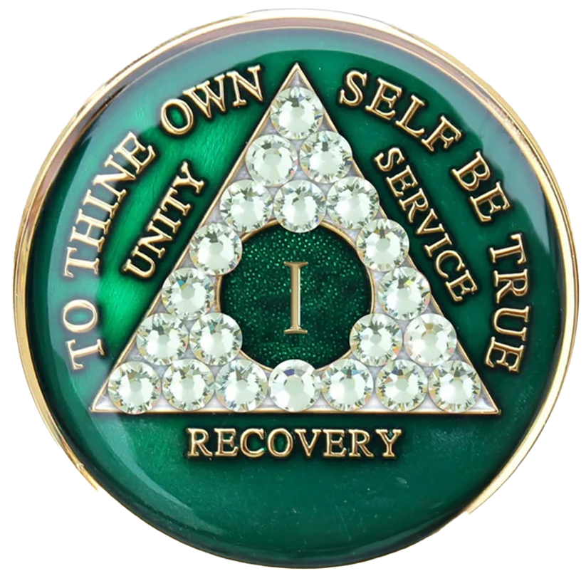 AA Coin, #A77. Green AA Medallion w White Crystals (Yrs 1-65)