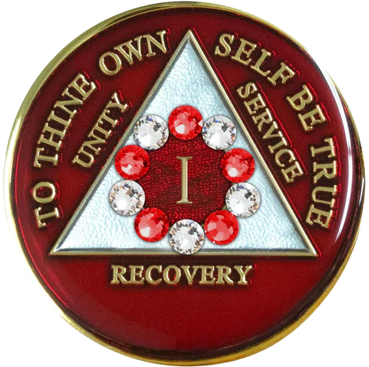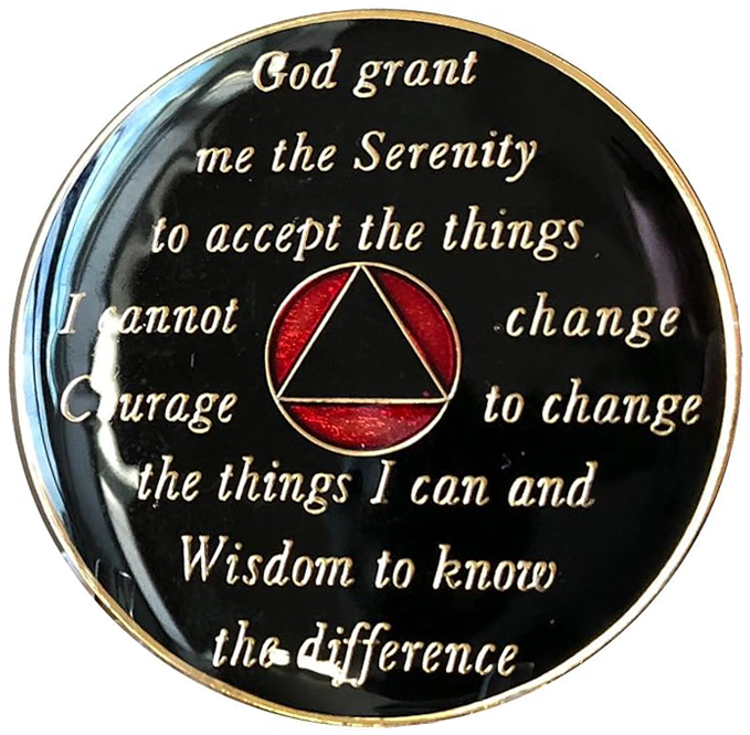 This recovery coin features a stunning multi-colored enamel design, engraved with 24Kt gold plating. On the front, the timeless 12-step program phrase "To Thine Own Self Be True" is engraved, along with the anniversary year in Roman numerals and the words "Unity, Service, Recovery." On the back, the Serenity Prayer is engraved.