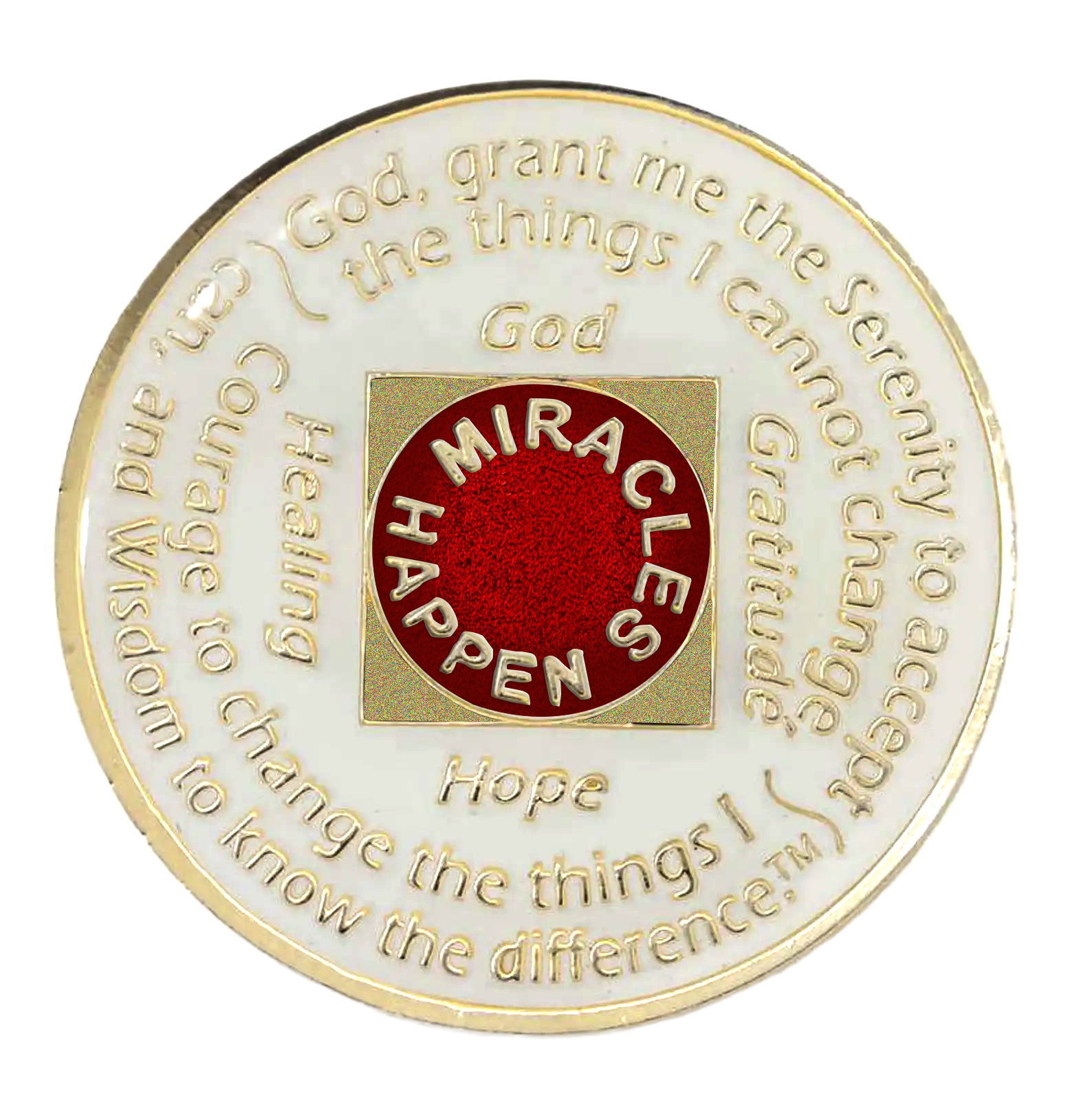This recovery coin features a stunning multi-colored enamel design, engraved with brilliant 24 kt gold plating. On the front, it reads: “Out of the Ashes of Recovery, Comes Renewal and Growth”, accompanied by the anniversary year in Roman numerals and the words “Just For Today, Serenity, Peace.” On the reverse side, you’ll find the Serenity Prayer, along with the words “God, Gratitude, Healing, Hope” and “Miracles Happen.”